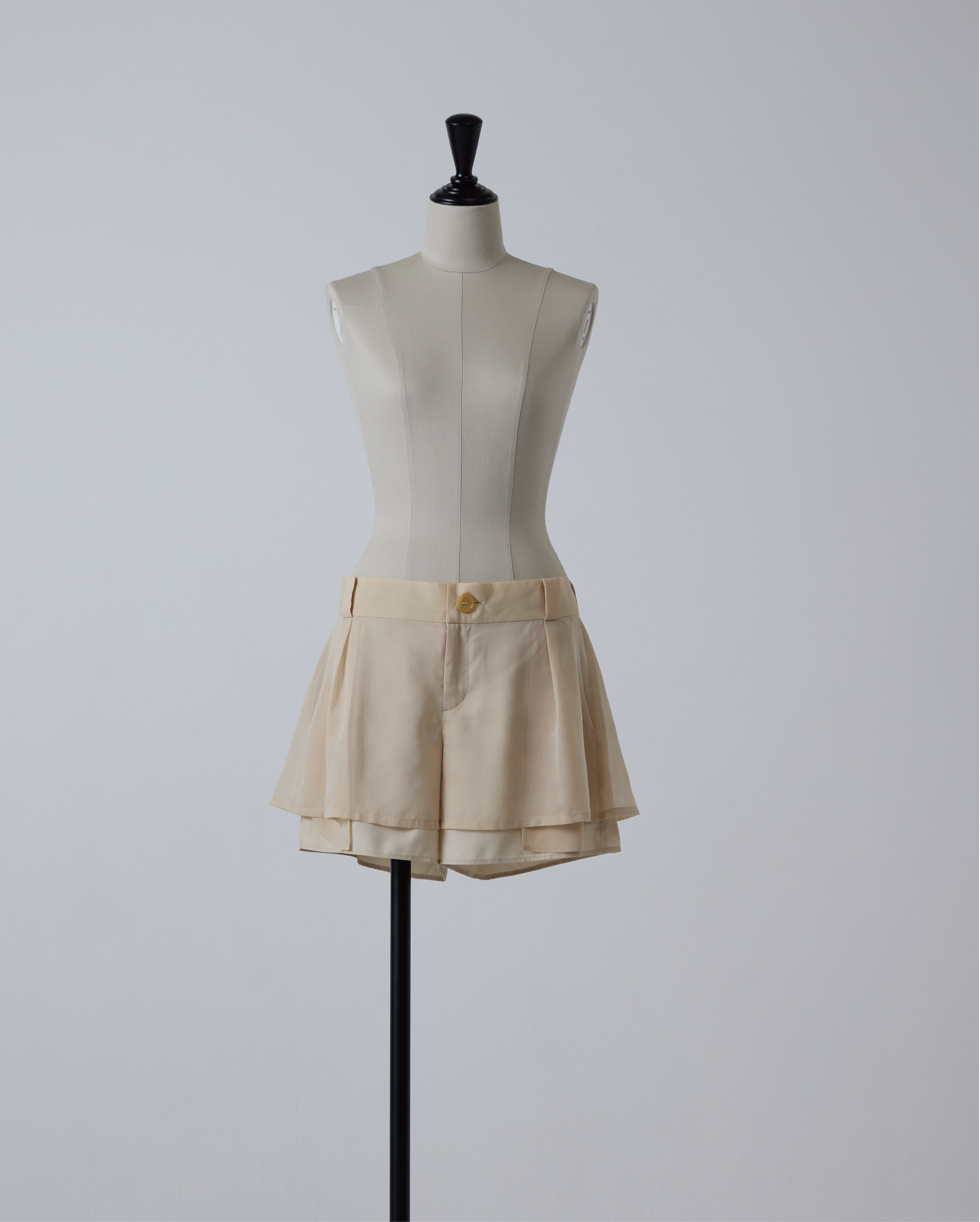 Sheer organza pants with a crisp and voluminous silhouette. Cupro lining ensures comfort while maintaining transparency. A sophisticated piece that balances modern edge with delicacy.